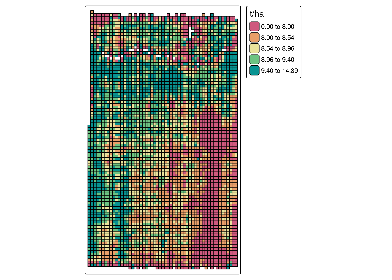 To produce a yield map using pacu, we will use the pa_yield() function. The package offers two algorithms: simple and ritas. In this post I will not go into much detail about the algorithms. There is more information about this in this paper.