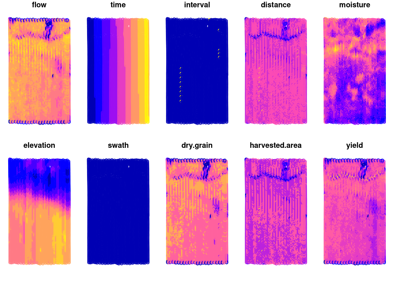 names(gartner.corn) <- c('long', 'lat', 'flow', 'time', 'interval', 'distance', 'moisture', 'elevation', 'swath', 'dry.grain', 'harvested.area', 'yield')