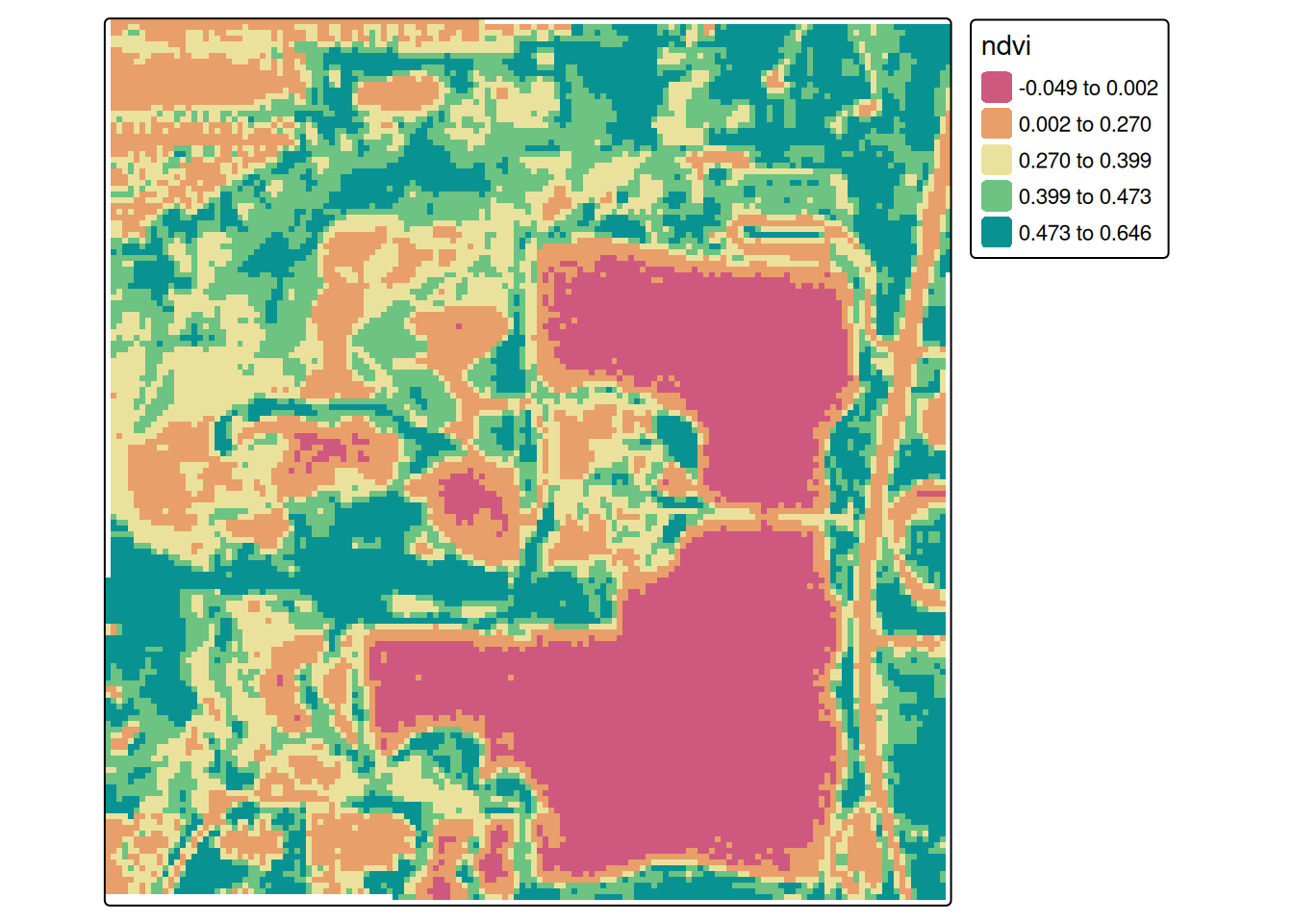 One of the pre-built vegeation indices within pacu is the Normalized Difference Vegetation Index (NDVI). This VI is often used as an indicator of crop health but in this case, we can see that it also shows us the lake quite well.
