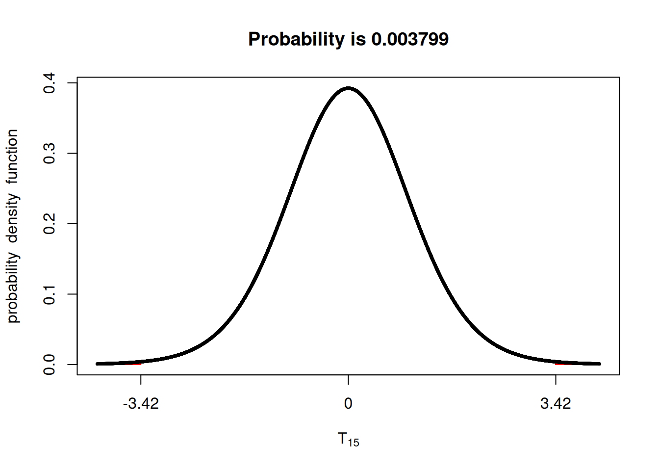 Great! We got a t-value that we can use to compare to the probability. Let’s use the fastGraph library again and check what is the probability that we get a value t-value outside of 3.42.