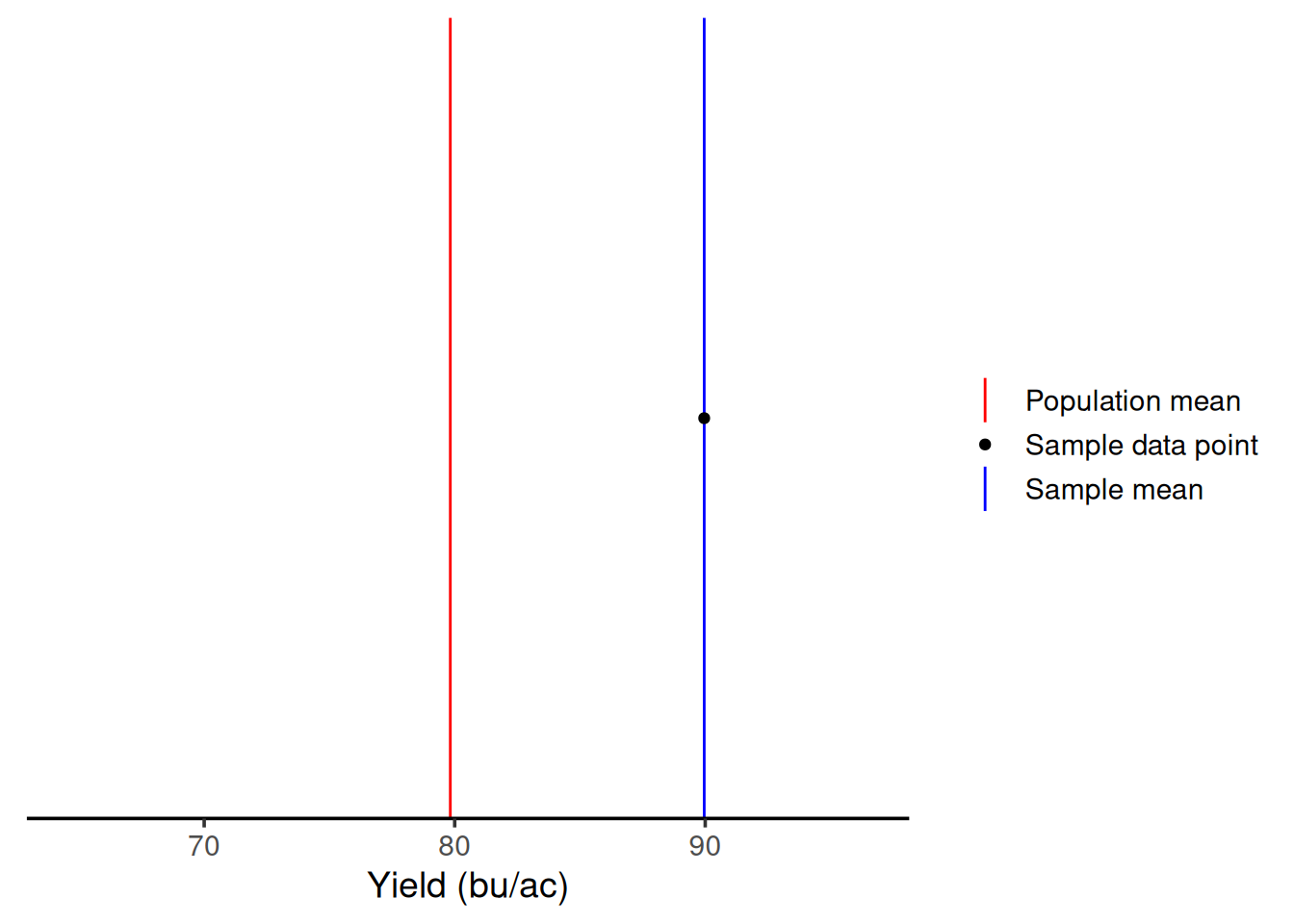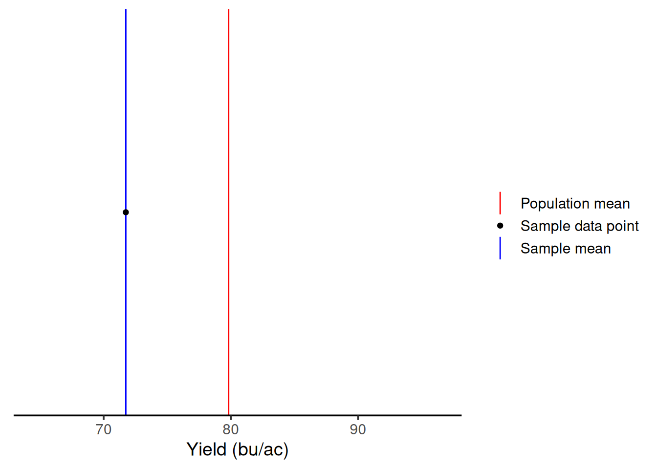 By chance, with one sample, we would end up with a sample average of 71.74 bu/ac. But, this is one time, right? Let’s say I had gone to that field in a different day and had sampled a different location. As we can see from the graph below, with one sample, I could have gotten an average of 89.95 bu/ac. This illustrates that when we have low sample sizes, there’s a lot of variability in our measurements. This means you’re getting two very different answers simply by because of the location within the field that you sampled.