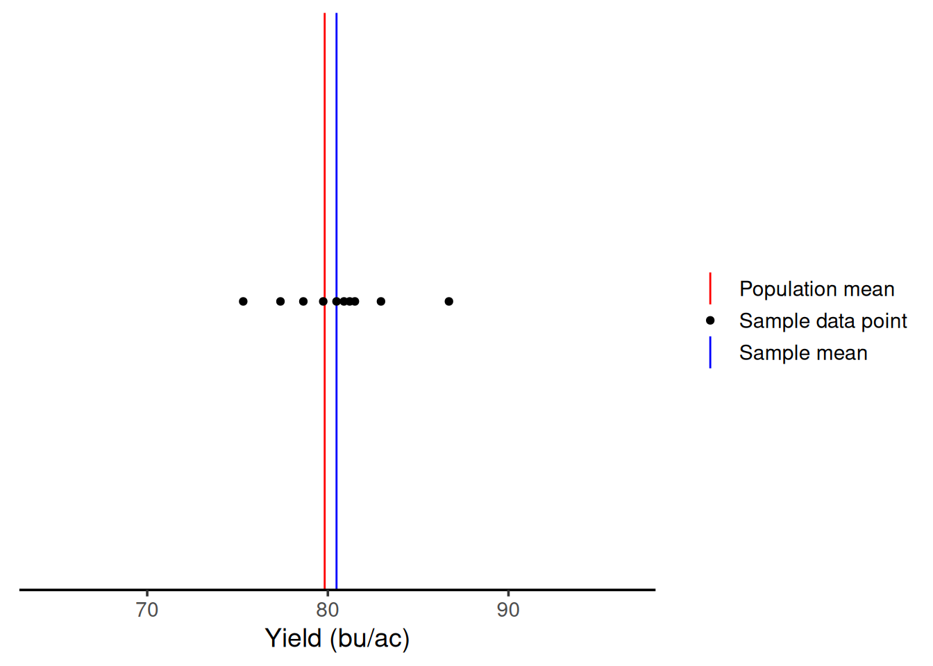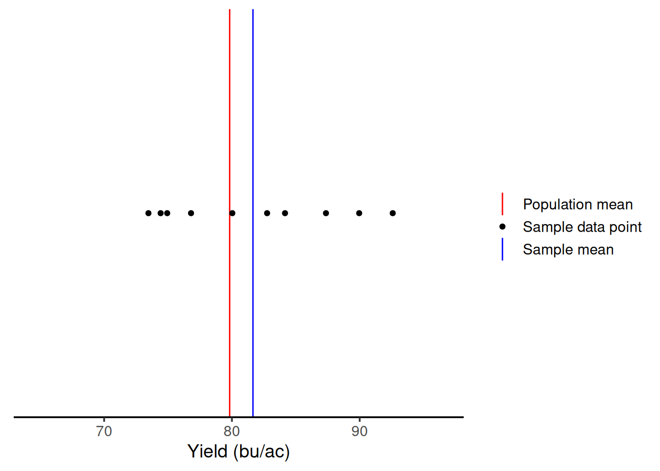 In agricultural science this is almost never possible, because the volume of fieldwork required to measure every single individual would simply be prohibitive to the work. If you have done field work before, can you imagine having to measure every single plant within an experimental unit? Instead, we rely on samples, right? This means that we collect from a subset of individuals and use those to learn about the population as a whole.