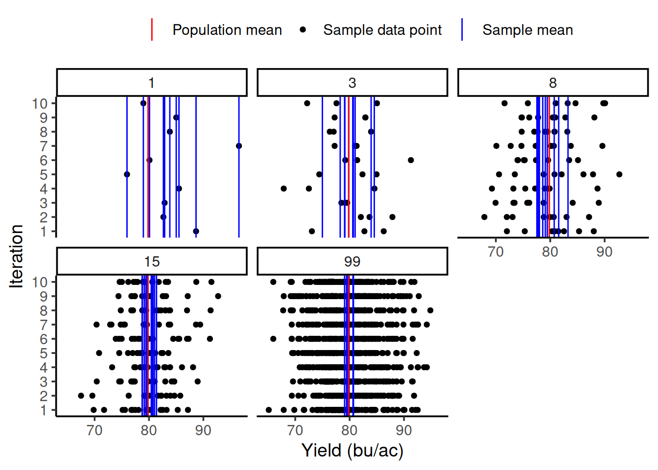 In the graph below, you can see on the y-axis the iteration number and on the x-axis the yield value in bu/ac. Just like before, the red line still represents the population mean. The multiple blue lines now represent the sample mean for each iteration. As you can see, as the sample size increases, the sample mean lines cluster around the population mean. This shows this decrease in variability of the sample mean as a function of the increase in sample size.