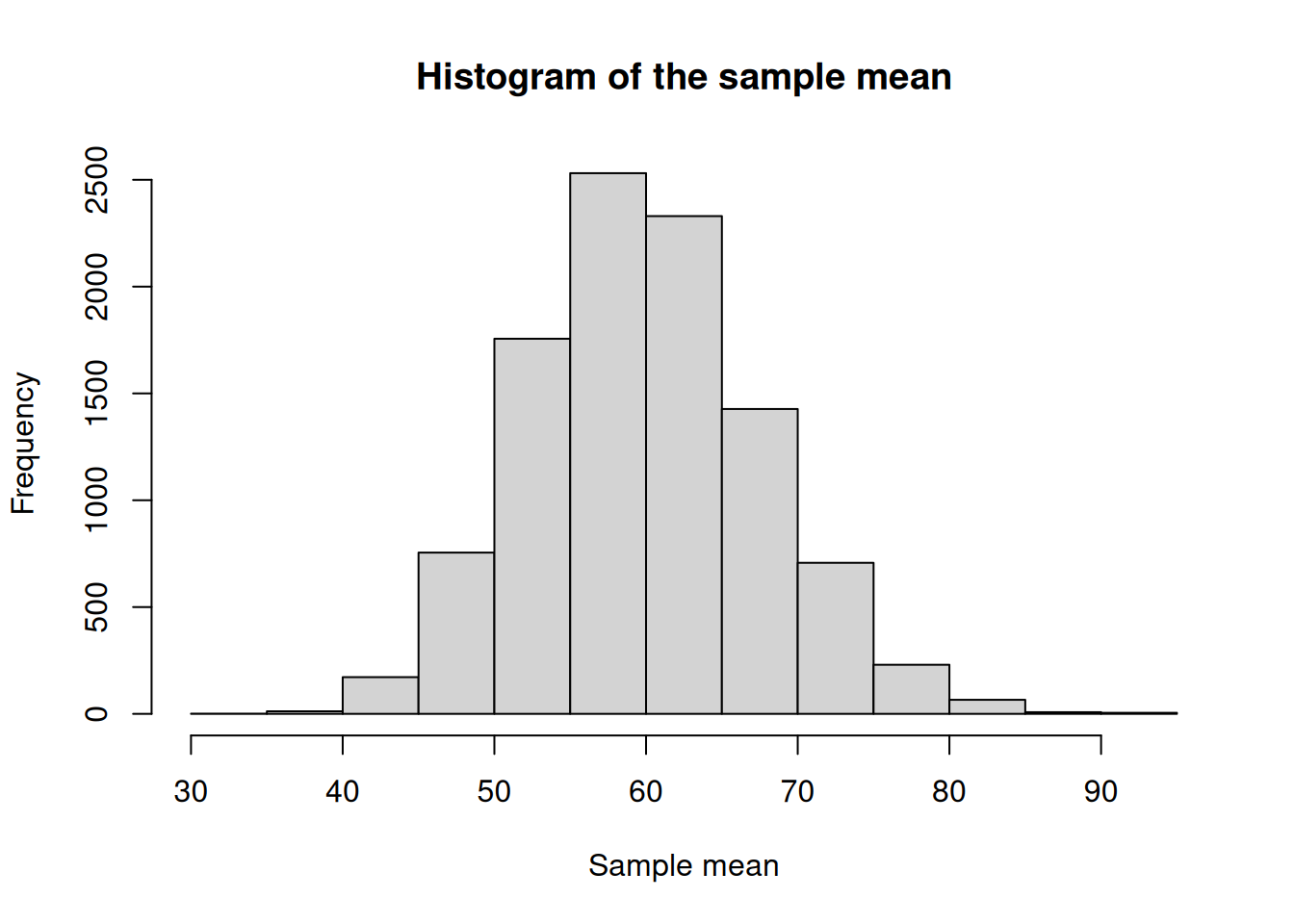 Below, is some code that will take 30 samples (\(n=30\)) from this population 10,000 times so that we can create a distribution. I am including it as an example but please do not focus on it too much. The important thing is that it represents us sampling from this clearly not normally distributed population many times.Then, the code plots a histogram of the mean. Can you see how, even though the population mean is not, the sampling mean is approximately normal?