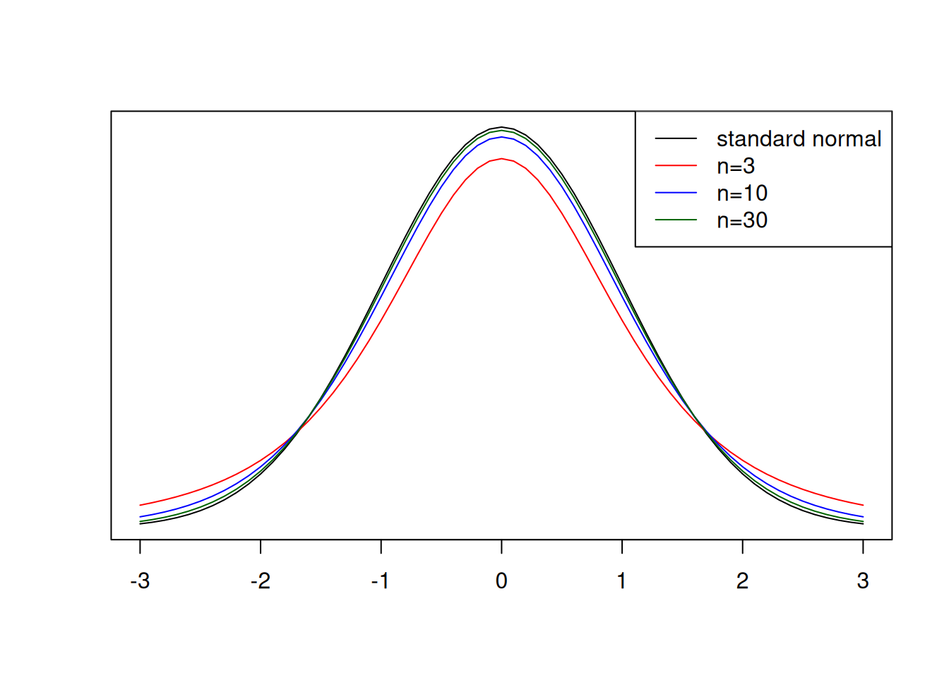 Let’s take a look at the \(t\) distribution in comparison to the standard normal distribution for different sample sizes, and then we can think about the effect of sample size.