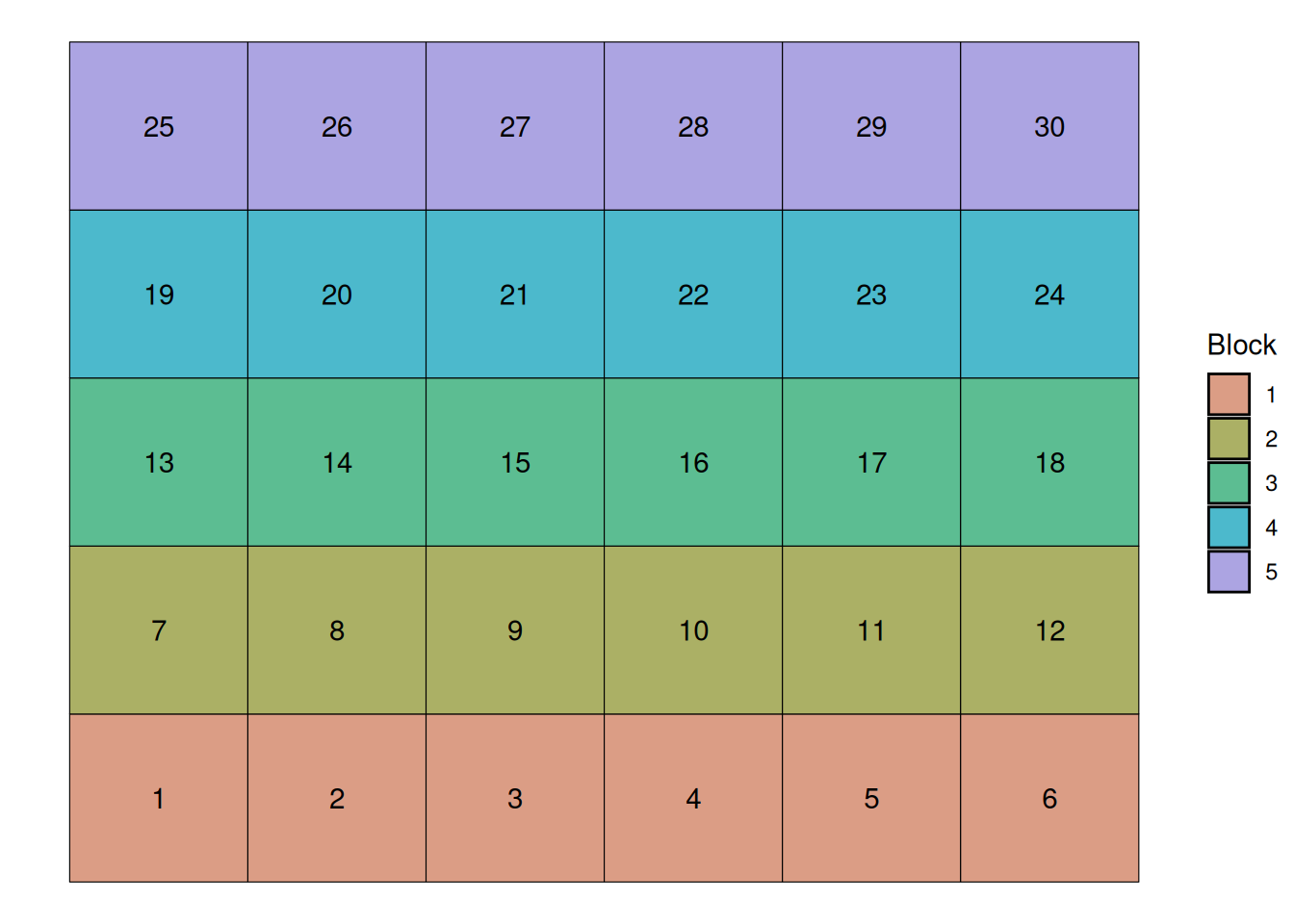 Since we know that the first two rows of plots sit in a lower area of the field, we can define blocks running horizontally. This will give us 5 blocks, as we can see below: