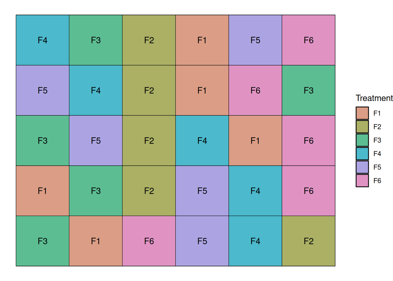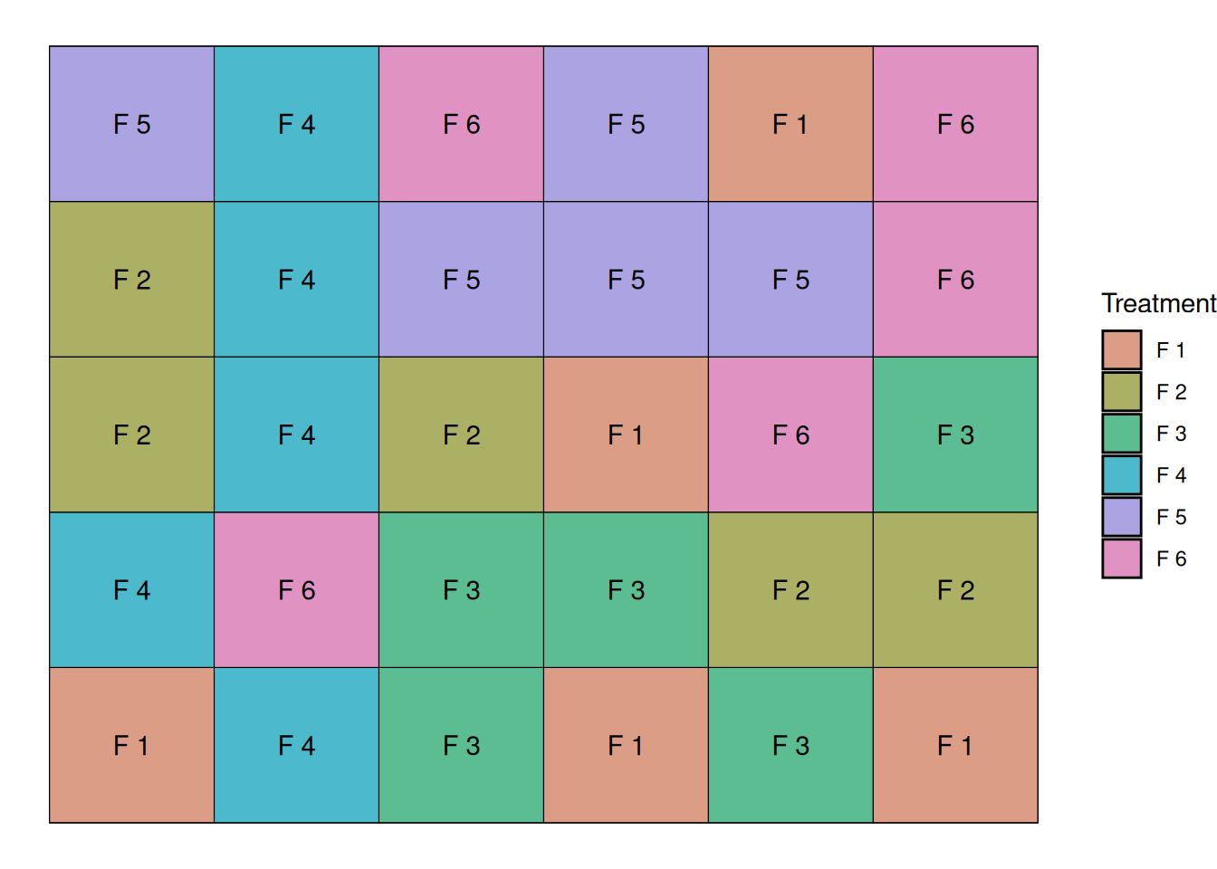 We can simply randomly assign the treatments to our experimental units going from 1 to 30. Fungicide treatments are coded F1 through F6 for.