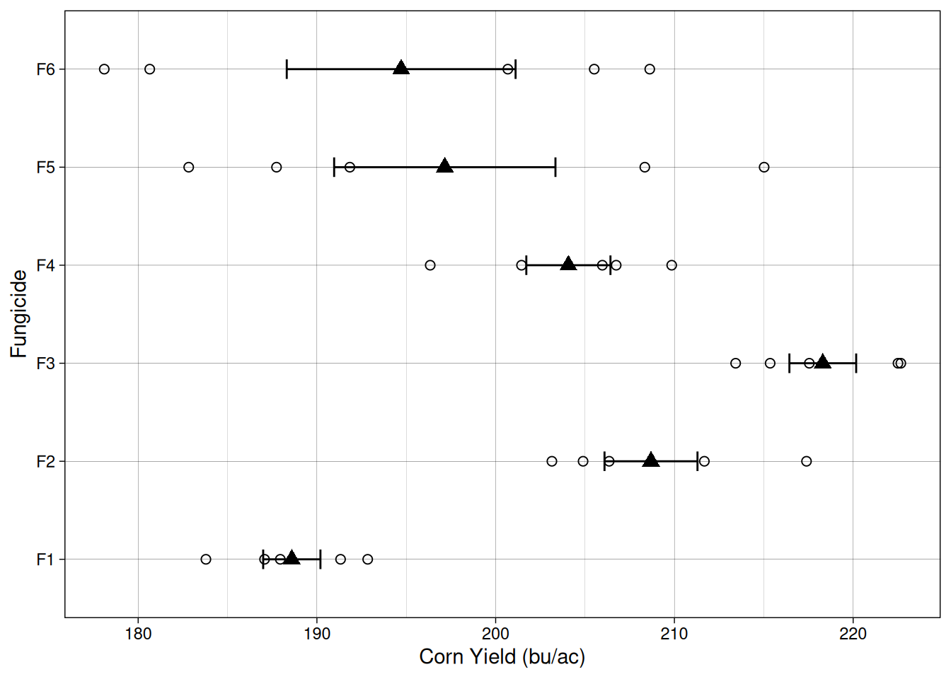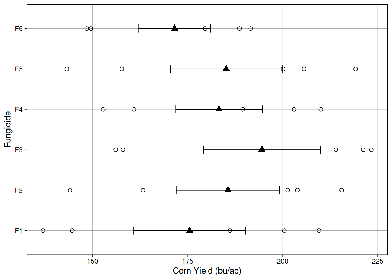 It seems like there is quite a bit of variability but maybe fungicide treatment F3 has a different mean? Let’s use a model to figure that out!