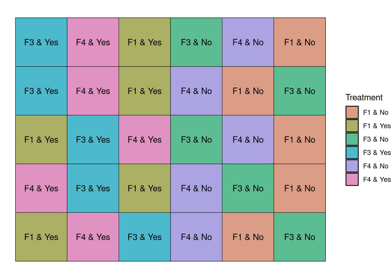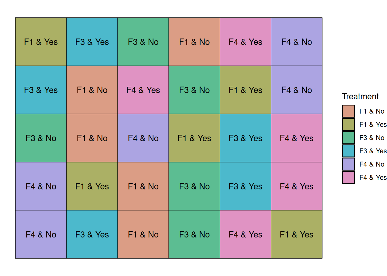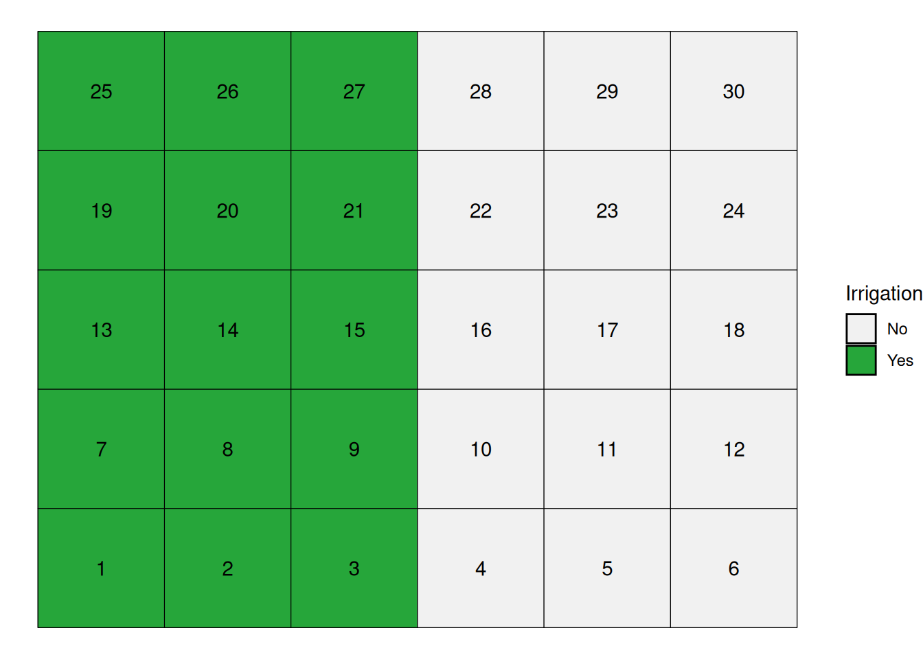 For example, in the factorial experiment we just constructed, we included an irrigation factor with two levels: Yes and No. In our simulated design we randomly assigned irrigation treatments to individual plots.
