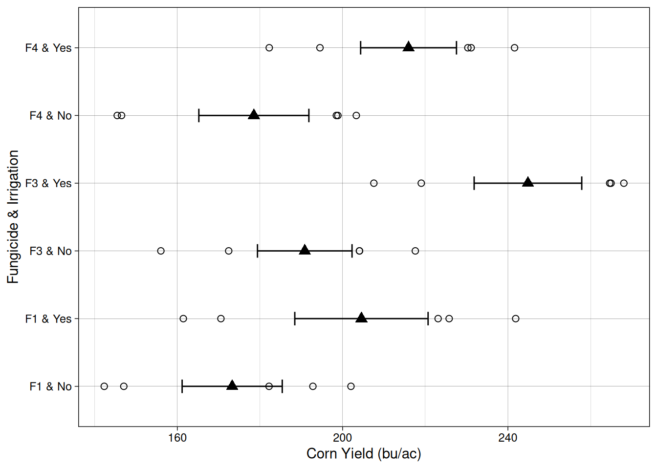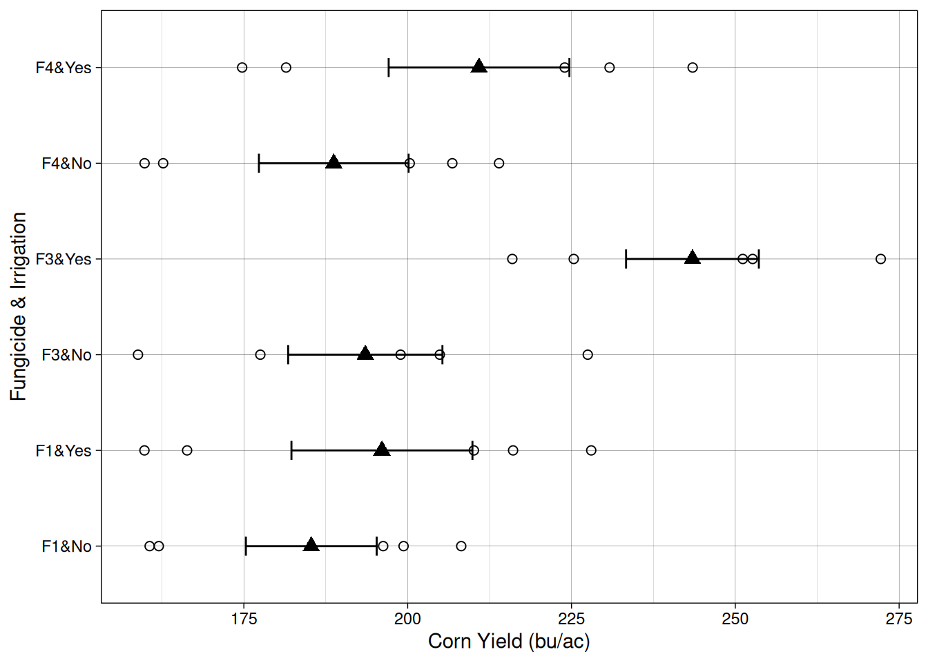 The ANOVA table output shows us strong evidence that both the fungicide and irrigation treatments have an effect on corn yield. Furthermore, the interaction row (fungicide:irrigation) shows us that our fungicide treatments behave differently whether there’s irrigation or not.