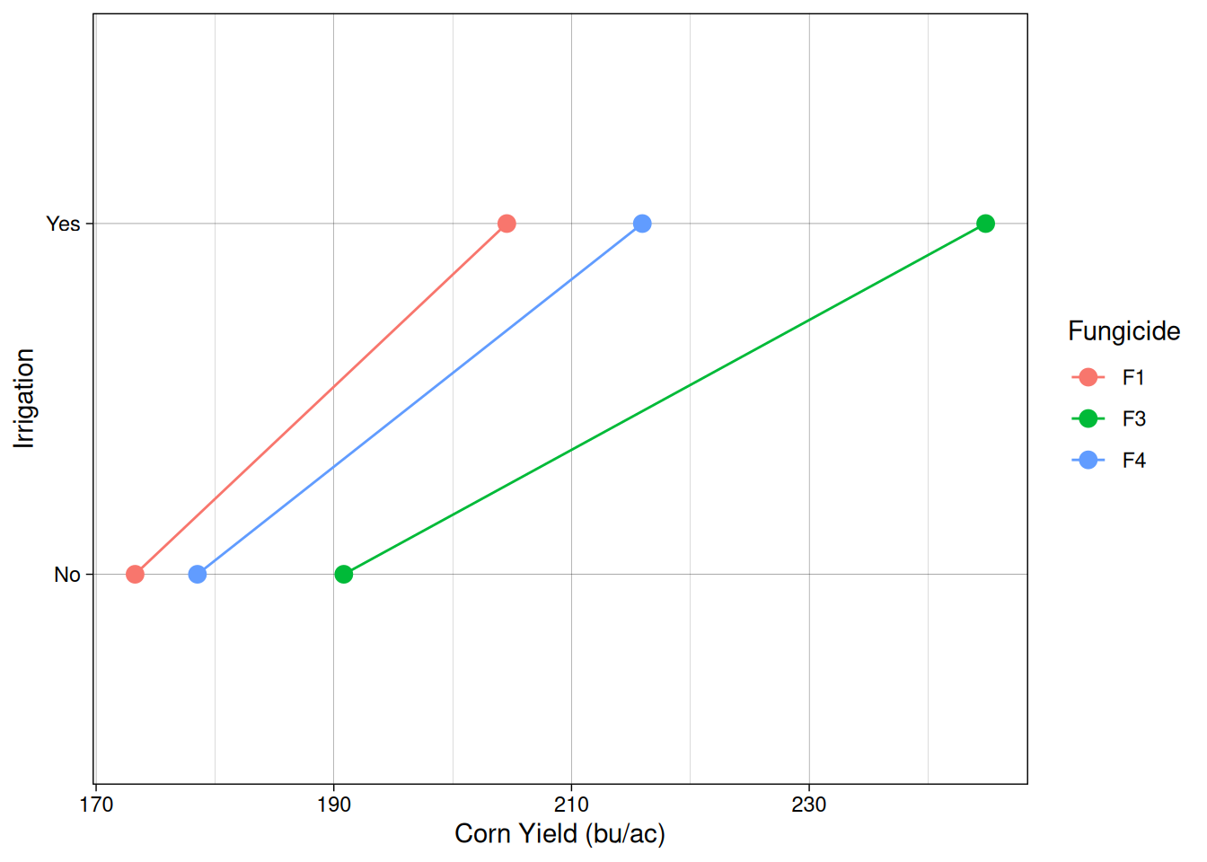 Now, is the effect of irrigation and fungicide different for the different combinations? That’s what the interaction term of the model will answer.