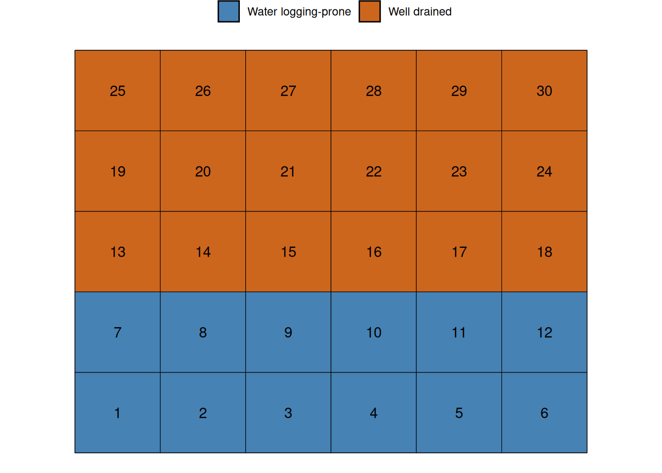 Notice that irrigation treatments are applied to groups of plots, not individual plots. This is what creates the split-plot structure and requires a different statistical model.