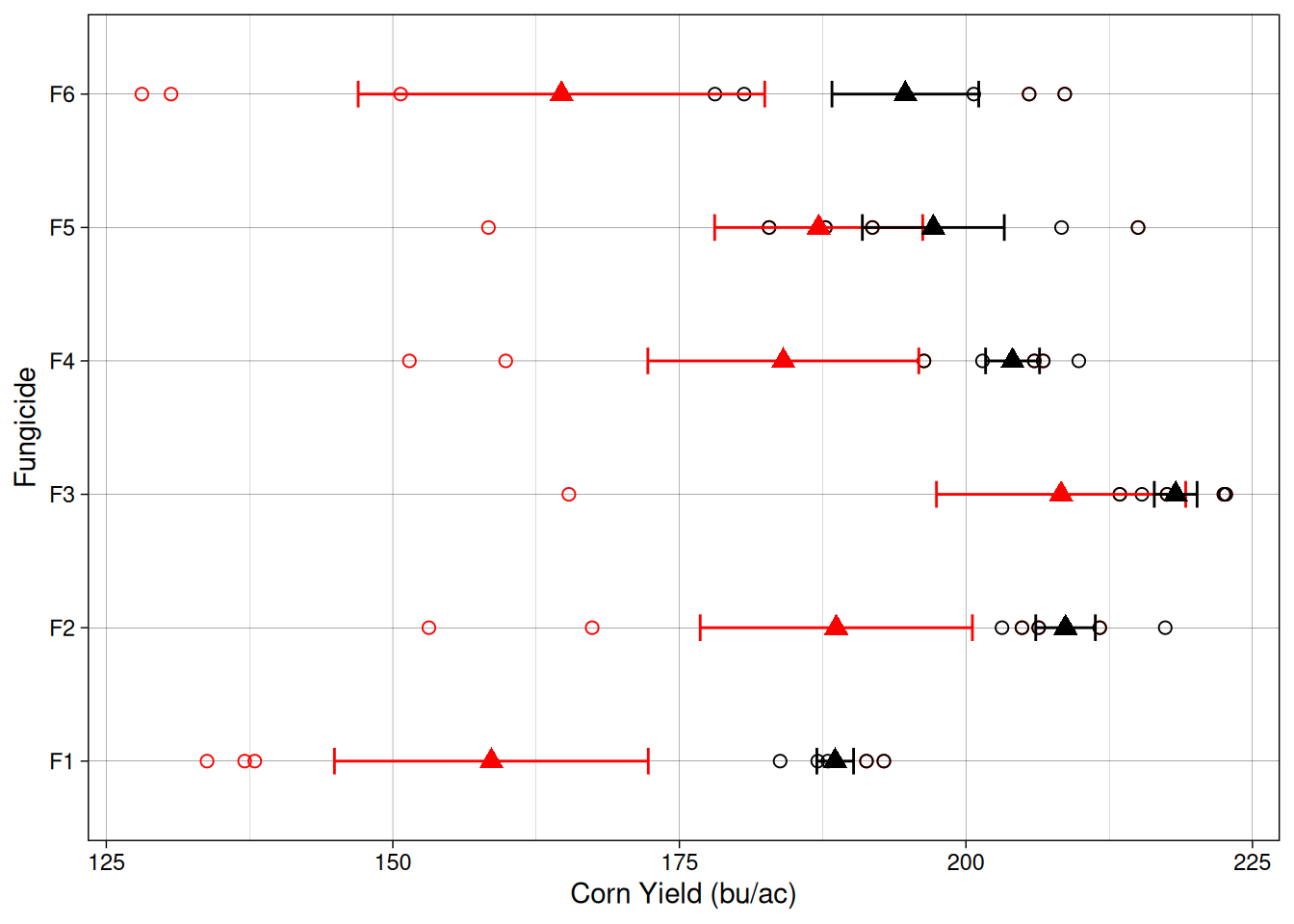 Let’s take a look at the data from this experiment. On the Y axis, we have the different fungicide-irrigation combinations.